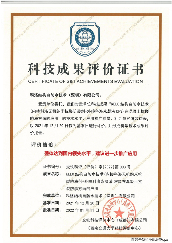 科洛結構自防水技術(shù)通過(guò)交鐵科技評價(jià)中心,西南交通大學(xué)科技評價(jià)中心的科技評審:KELO科洛結構自防水技術(shù)(內摻科洛無(wú)機納米抗裂防滲劑+外噴科洛永凝液DPS)被評為:國內領(lǐng)先水平。
